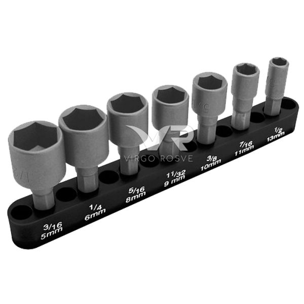 Puntas y dados forjados en acero al cromo vanadio. Dos puntas planas 3/16" y 1/4", dos puntas de cruz PH1 y PH2, dos puntas torx T15 y T20. Dados de 1/2", 7/16, 3/8", 11/32", 5/16", 1/4" y 3/16"