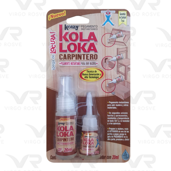Kolaloka carpintero con pegamento de 10g y activador de 20ml, fácil de aplicar.