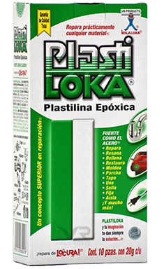PlastiLoka verde 20 gramos. Con fórmula especial que al mezclar sus dos componentes adquiere dureza, impermeabilidad y resistencia a la corrosión.